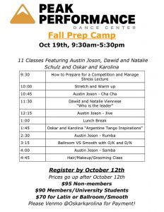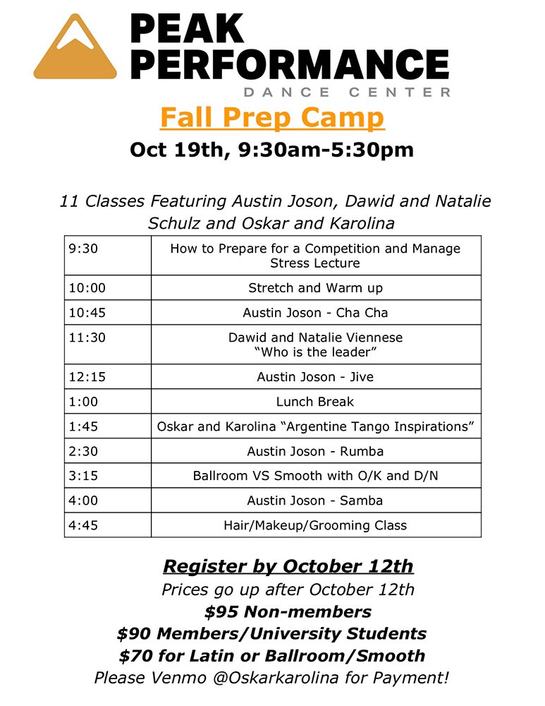 Peak Performance Dance will hold a Fall Prep Camp on October 19, 2019. Registration due by October 12. See the flyer below for details.