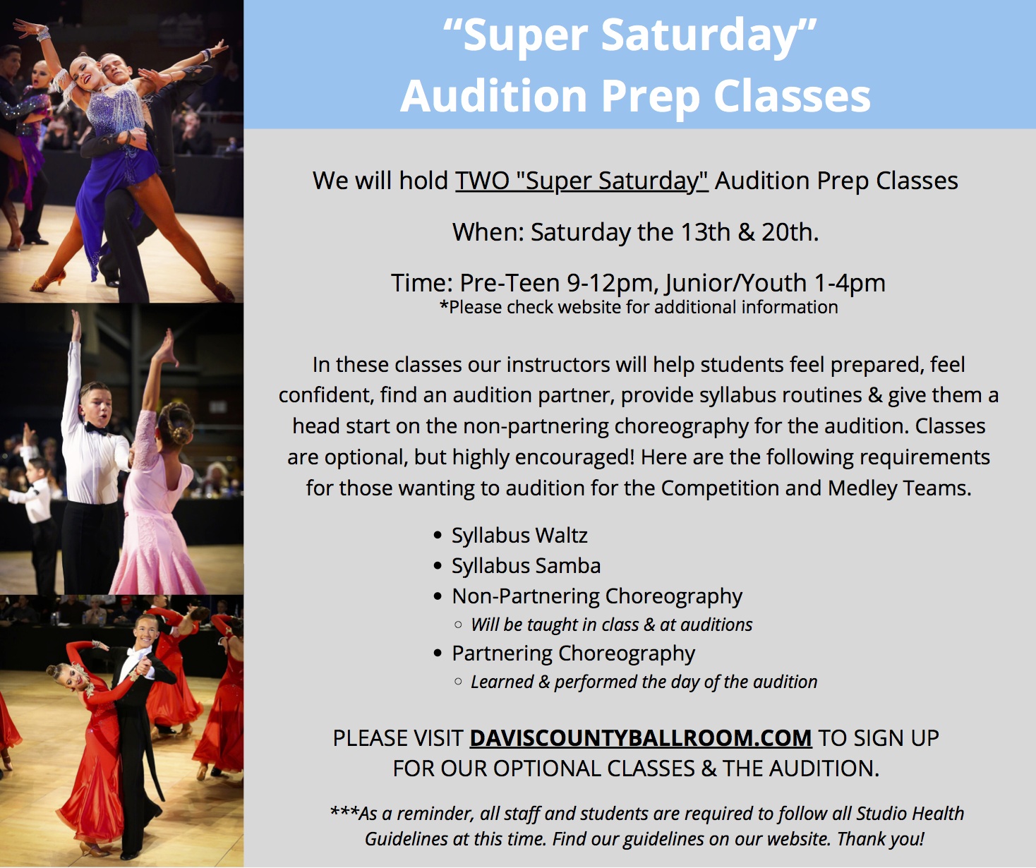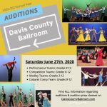 “Auditions for Davis County Ballroom will be held June 27.  Please click on the link below for all  the detailed audition information.  You are also invited to come to our Super Saturday Audition Prep Classes on June 13 & 20.  We are looking forward to another fantastic year!