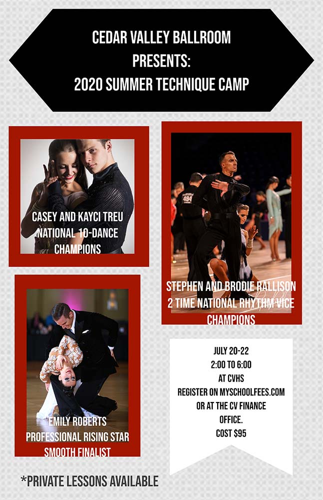 Cedar Valley Ballroom will hold a 2020 Summer Technique Camp July 20-22 at Cedar Valley High School. Dancers can register at myschoolfees.com or at the Cedar Valley Finance Office.