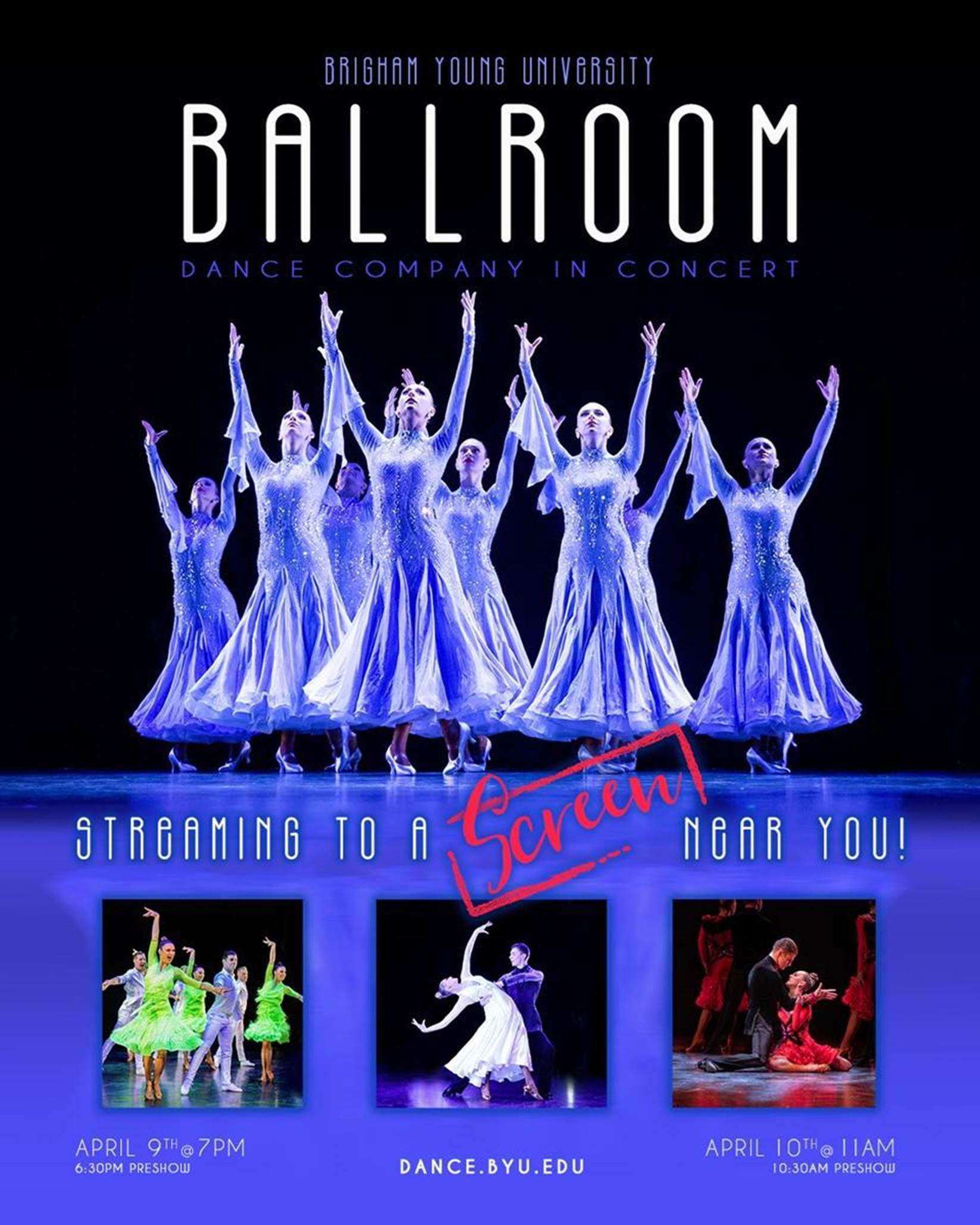 The BYU Ballroom Dance Company will live stream their concert for free on April 9 & 10, 2021. The program will only be available live at the time of broadcast. The program will be available on dance.byu.edu at the following times: