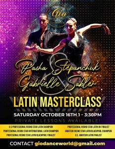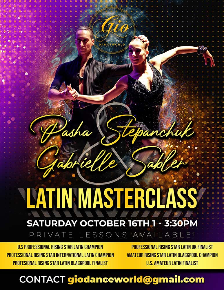 U.S Professional Latin finalist, U.S Professional Rising Star Latin Champion, Professional Rising Star Latin Blackpool Finalist, Professional Rising Star UK Finalist, Amateur Rising Star Latin Champion, Pasha Stepanchuk & Gabrielle Sabler will be teaching Master Classes and Private Lessons in Utah October 15th and 16th at Gio Danceworld in Pleasant Grove. Limited availability so pre-registration is required. If you have any questions or would like to register please email giodanceworld@gmail.com or text at 801-360-3897.