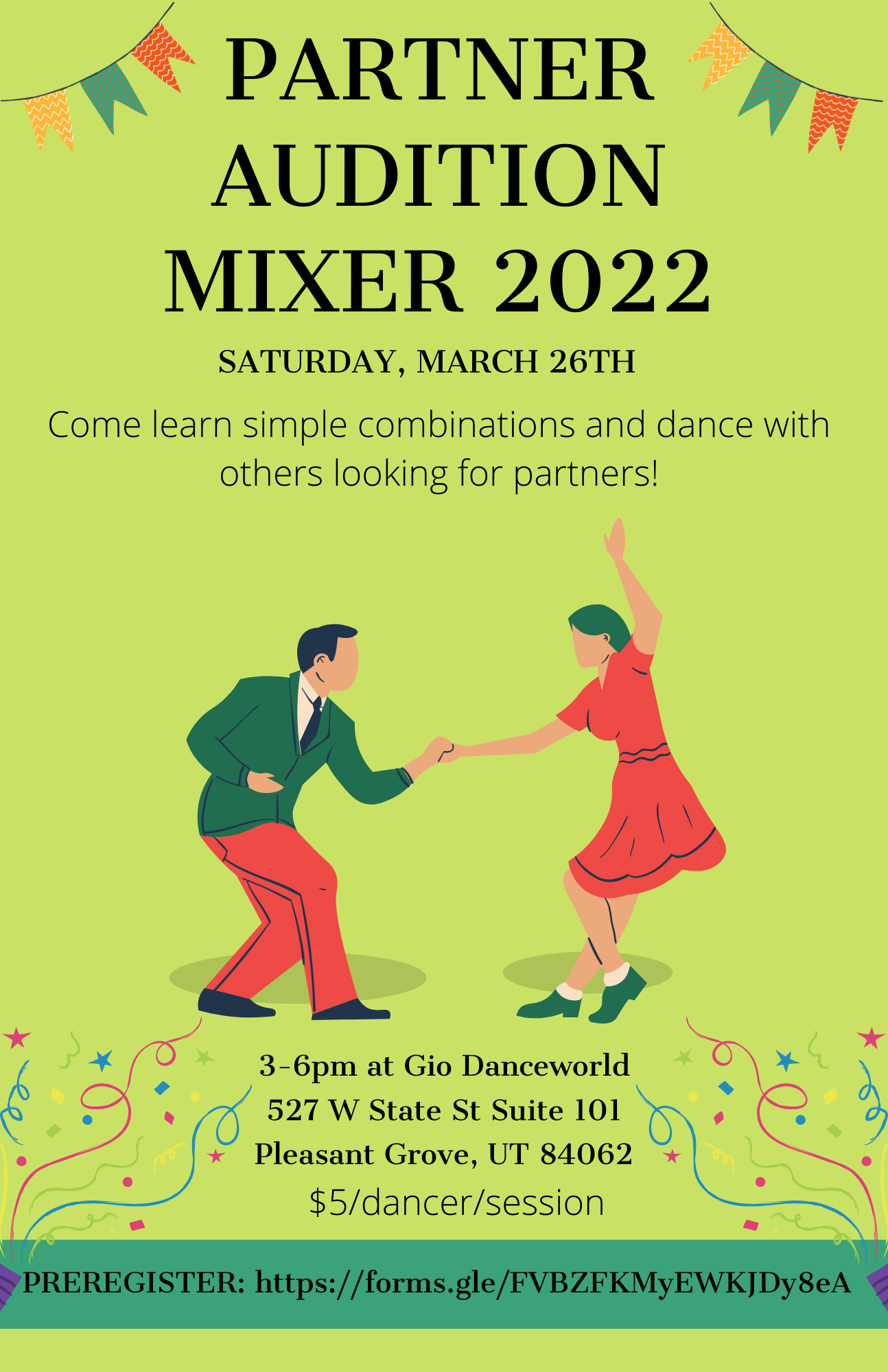 Below is information about a Pre-Teen/Junior/Youth partner audition mixer this Saturday, March 26th. Dancers will learn some simple combinations and dance with others looking for competition partners.