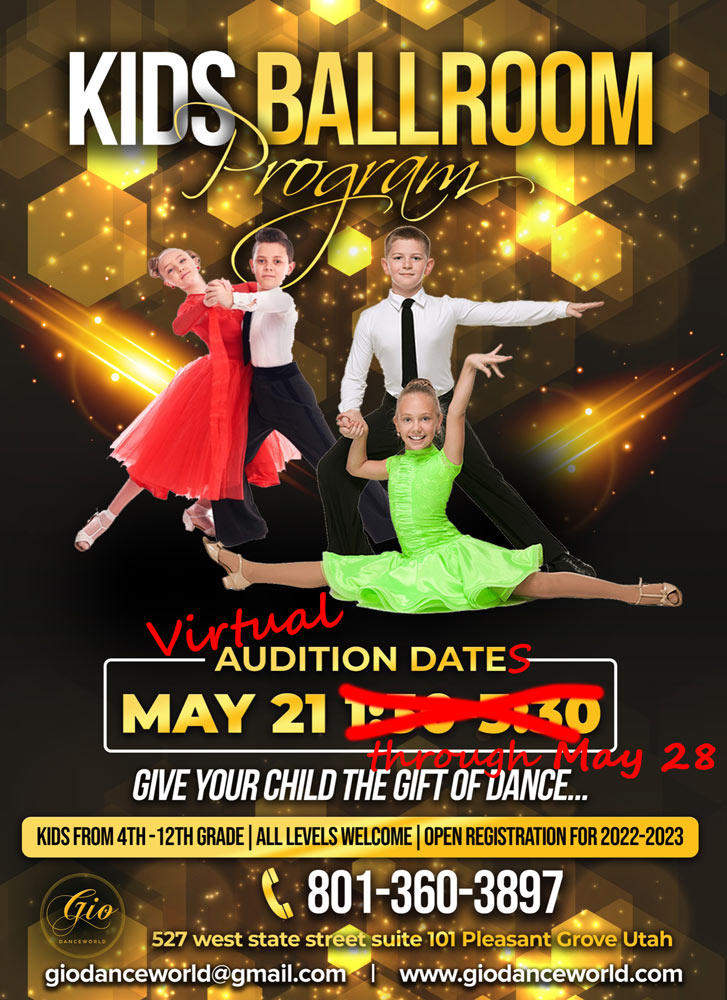 The tryouts for the Gio Dance World Studio teams were originally scheduled for tomorrow (May 21, 2022). Unfortunately, the studio director Gio has tested positive for COVID. So, she is going to hold tryouts virtually! Auditions for Pre-Teen through Youth will be done by video submission. Please register virtually at the form here and submit your tryout video of Waltz or Foxtrot and Cha Cha to giodanceworld@gmail.com. Auditions may be submitted until May 28th. Please see further information below: