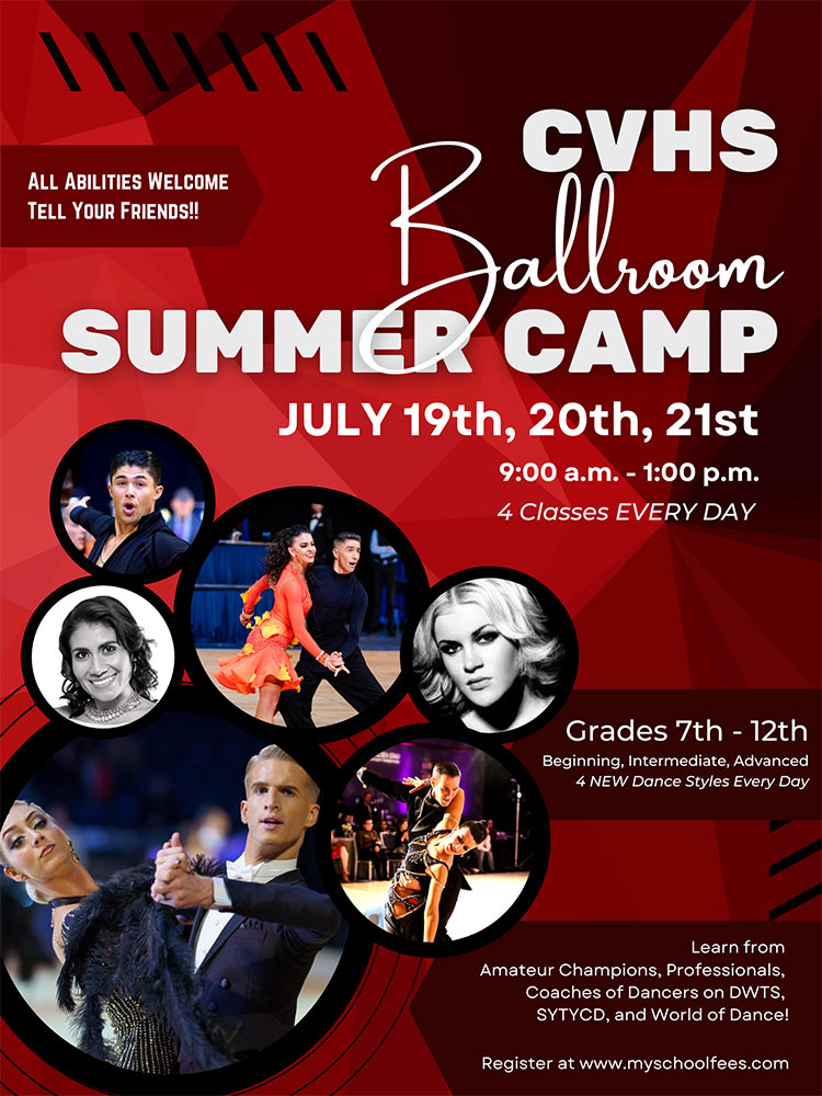 Registration and payment are through MySchoolFees.com. After registering or signing in with your MySchoolFees account, select Cedar Valley High School > Show Public Items > Ballroom > Ballroom Camp 2022. The camp cost is $100. For more info, visit the CVHS website.