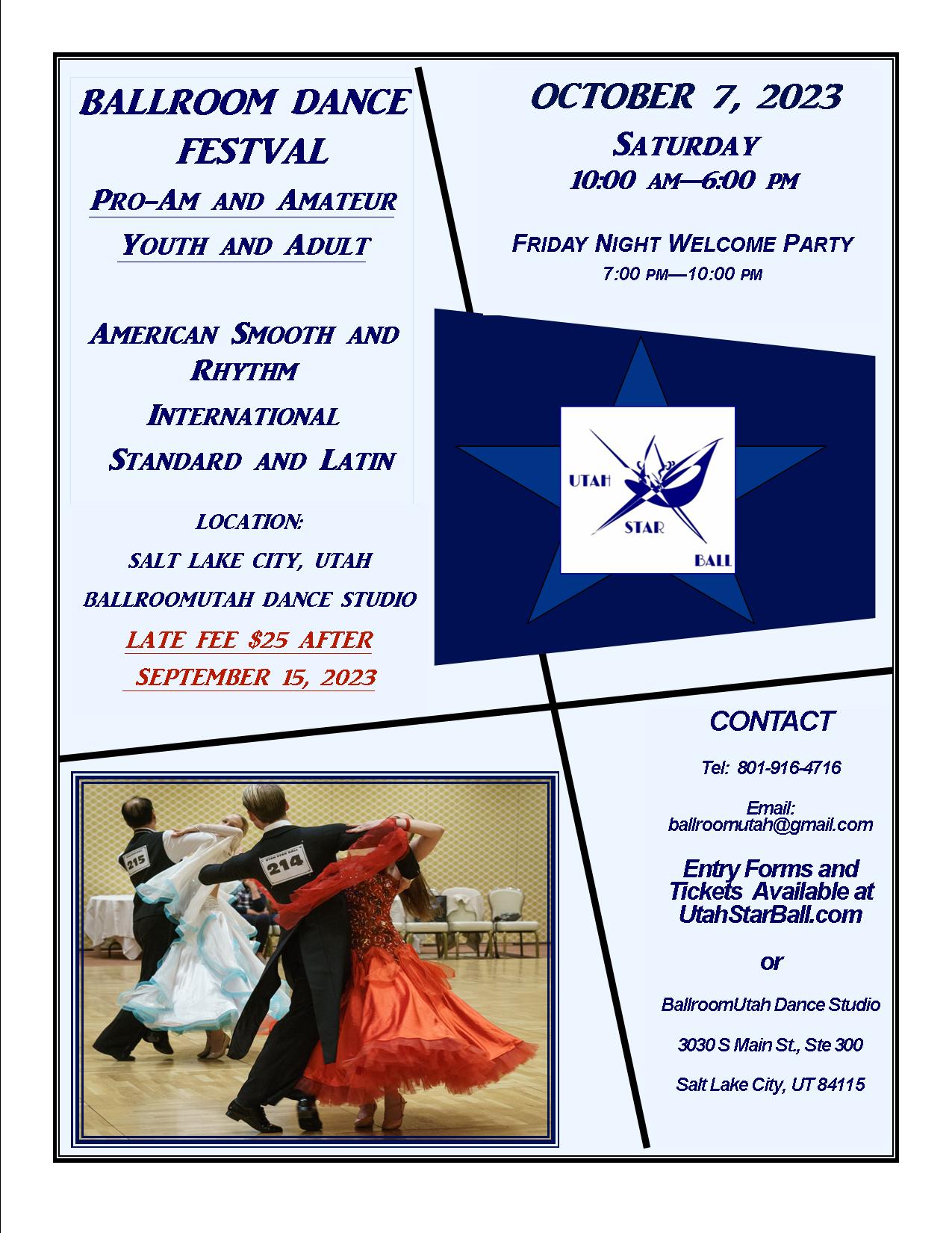 The 2023 Utah Star Ball Fall event will be held Saturday, October 7, 2023 from 10 am – 4 pm at BallroomUtah Dance Studio in Salt Lake City.