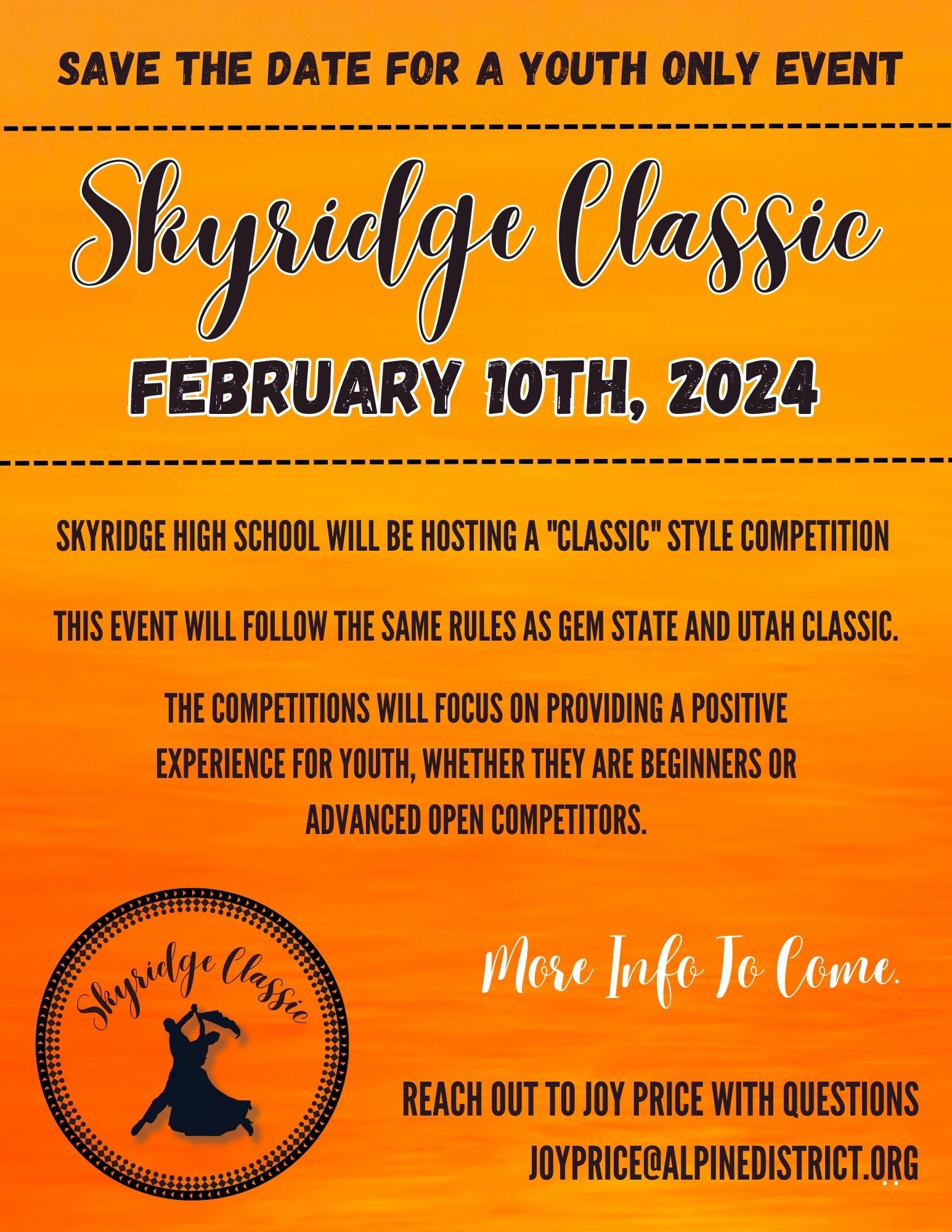 With Utah Classic unfortunately canceling, Skyridge Classic will now be hosting YOUTH SOLO CABARET events on Friday, February 9th. Registration for this event only will close on January 30th.
