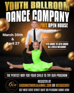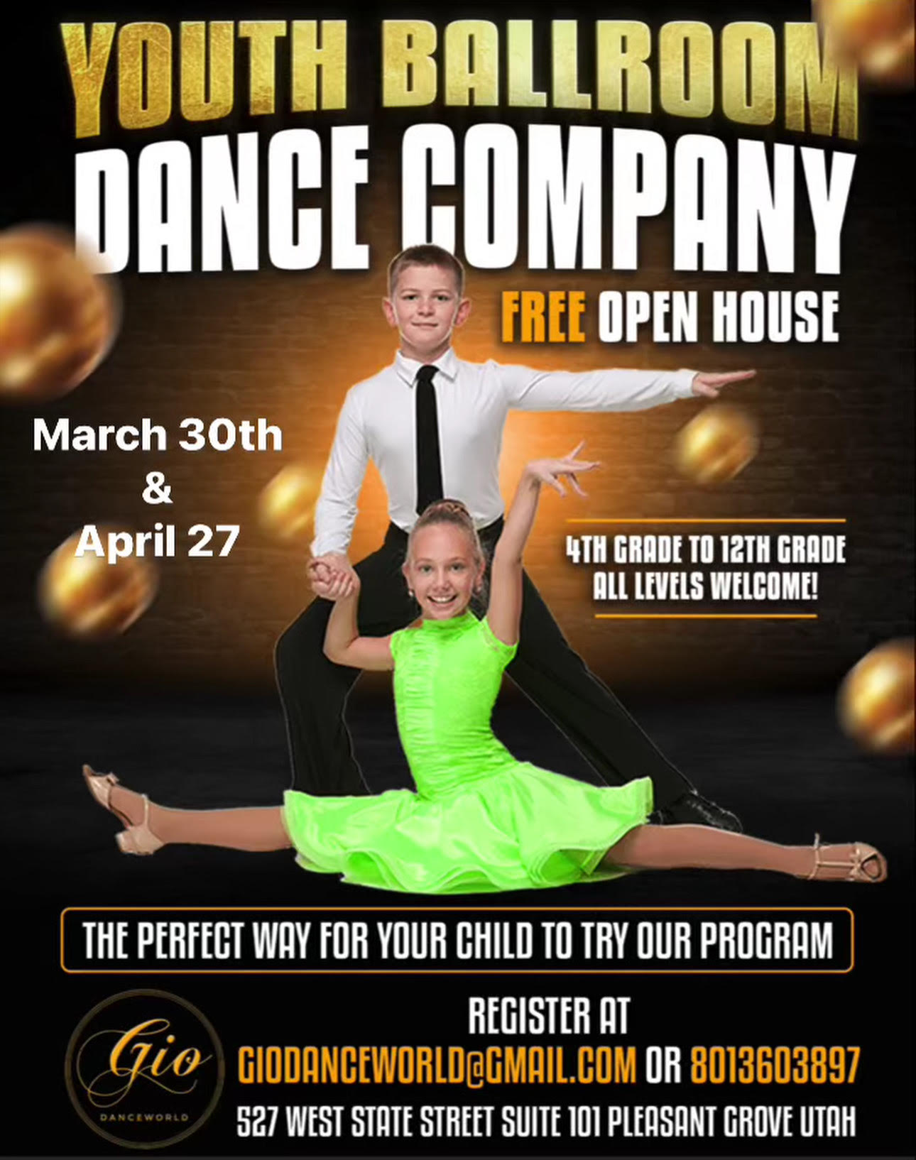 All levels Welcome! We have classes and teams for all ages from 4th-12th grade (Elementary- Highschool). Please pre- register at giodanceworld@gmail.com or text us at 801-360-3897.