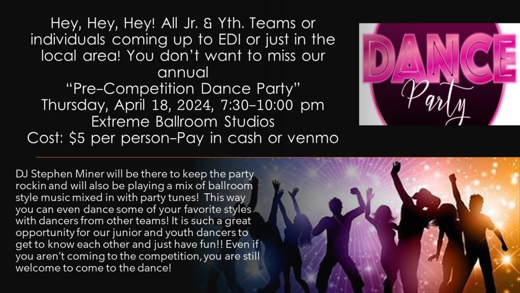Don’t forget that the registration deadline is this Sunday (March 31) for the 2024 Extreme DanceSport Invitational! The competition is hosted by Extreme Ballroom and will be held on April 19 & 20, 2024 at Madison Jr High in Rexburg, ID.