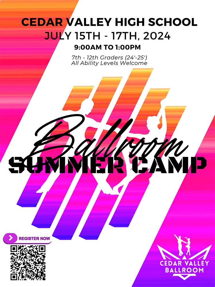 Open to all students who will be in 7th-12th next school year. Join us at Cedar Valley High School for three intensive days of Ballroom dancing. Four hours of instruction, each based on a different style from International Ballroom/Latin to American Rhythm/Smooth.