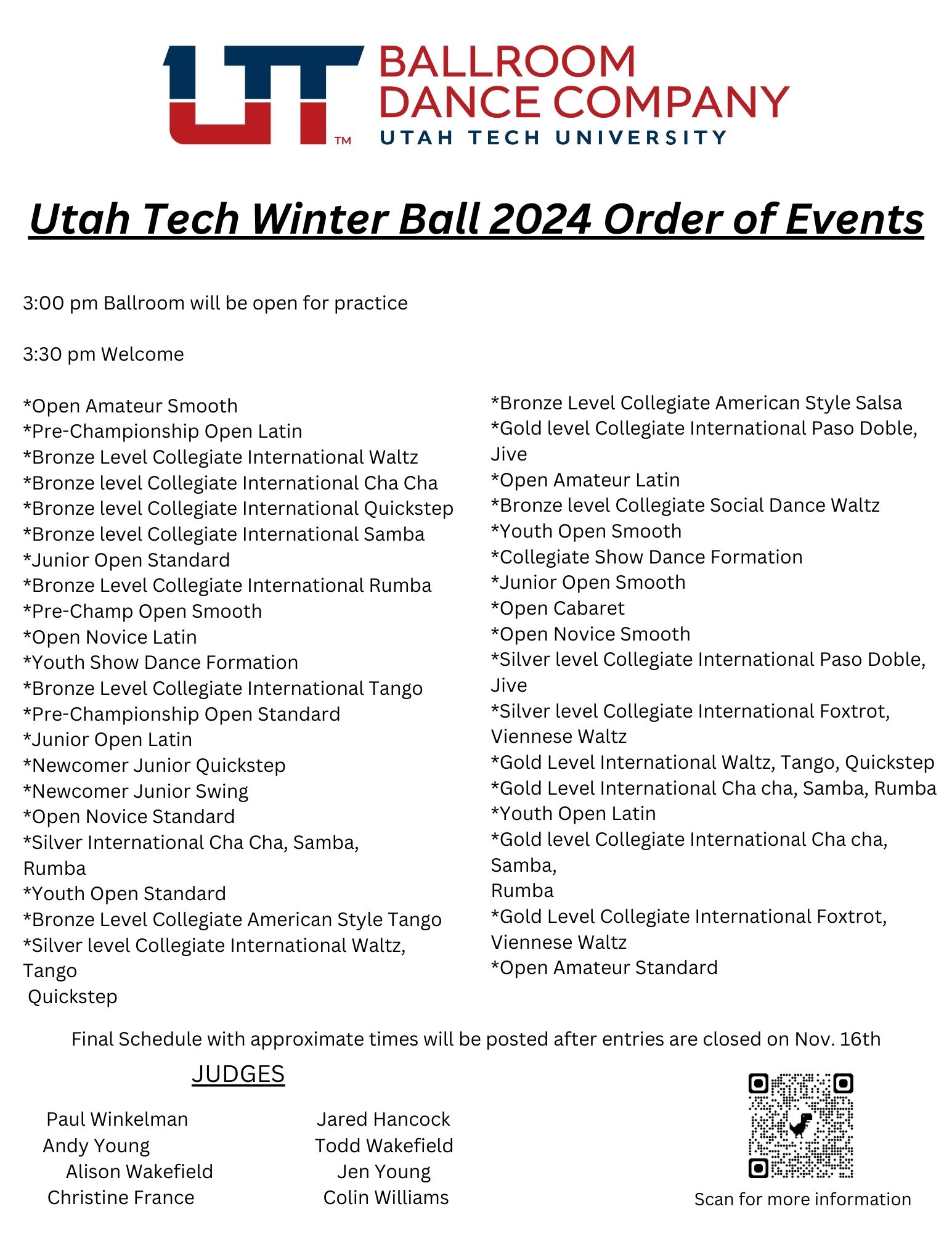Registration is due November 18. See the event roster, judges, and QR link in the flyer below.