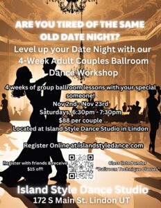 Island Style Dance Studio will be offering an adult couples dance workshop in November. See the information below: