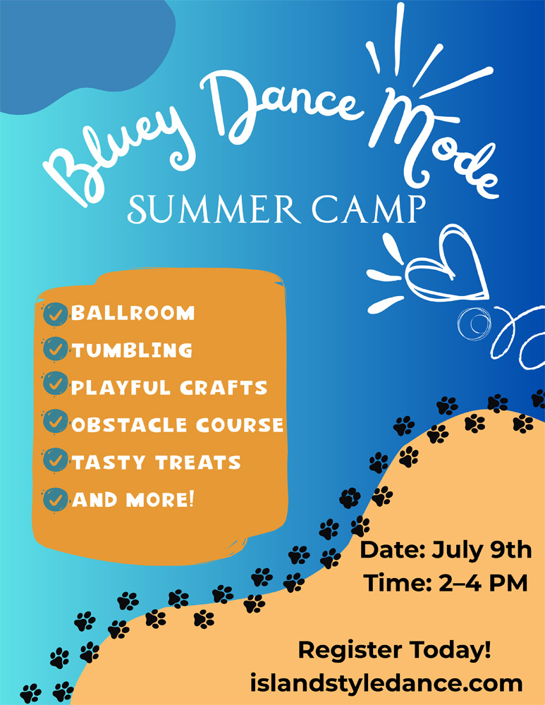 Island Style Dance Studio will offer a Bluey Dance Mode Activated! Ballroom camp for ages 4-7 on July 9, 2025. Dancers can register here.