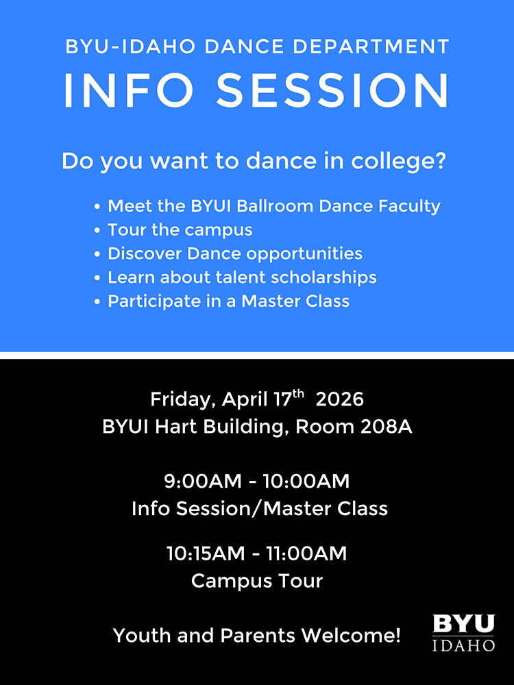 The BYI-Idaho Dance Department will have an information session on April 17, 2026 at the BYU-I Hart Building, Room 208A from 9 – 10 am with a campus tour following from 10:15 – 11:00 am.