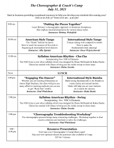 2021 Choreographer & Coach’s Camp now has a virtual option for those who cannot attend in person! Virtual attendees will be able to watch all sessions live via Zoom, as well as receive video recordings of all sessions. Virtual price is the same as in person. Those wanting to attend virtually should contact Elaine Grenko at
